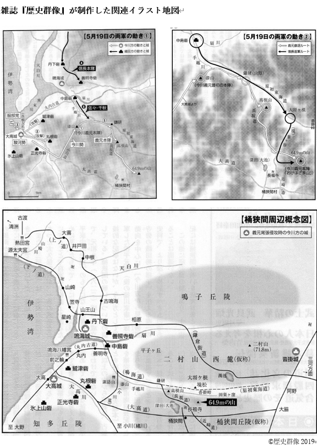 しかし「首巻」によれば前夜十八日夜に松平隊が大高城への兵運搬を行っていることは、織田方の間諜が信長に注進したとの記述により判明しているので、今川勢も兵入れの護衛を兼ねて、松平隊と一緒に大高城に入った方が合理的ではないか。そして、義元自身も今川勢、松平隊と行動を共にして、前夜の内に大高城に移っていたと考えた方が自然である。