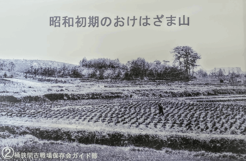 義元が次に選んだ陣地が、牛一が「首巻」で「おけはさま山に人馬の休息在之」という場所、すなわち多くの研究者が桶狭間山に比定する「六四・九メートルの山」である。ここは桶狭間村の東側にあって周辺で最高峰の山であり、高根山とは一キロほどしか離れておらず、その間は鳴海~桶狭間道(長坂道) 一本しかない。また高根山を東に下りた所は『陽明文庫本』によれば深田であったとされるから、それを前にして義元本陣は鉄壁の防御陣地となった。義元はここで全軍の撤退を待った。ここまで彼の作戦はすべて成功していたと言 っていいだろう。