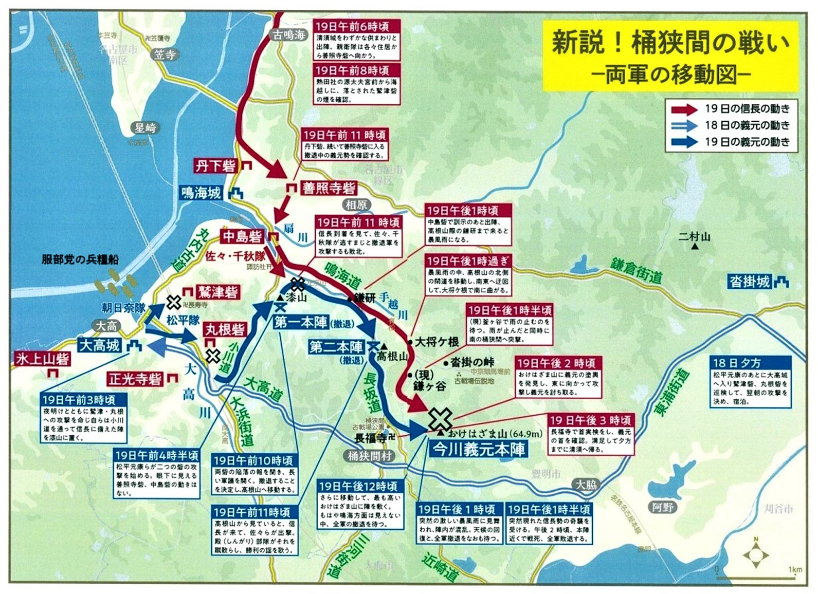 ①義元は午前十時頃に沓掛城を出て昼前に桶狭間へ着いた。信長も同じく昼前に善照寺砦へ到着したが、その頃には今川「前軍(藤本氏の造語)」が善照寺砦の「南東」の丘陵地帯に進出してきており、 戦場は今川方が支配していたと見なし ている。
